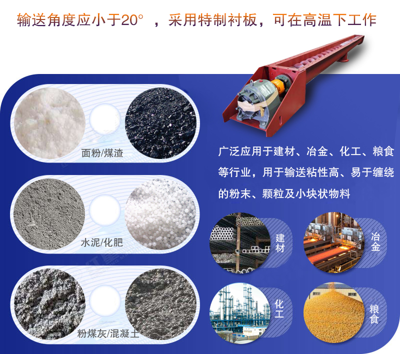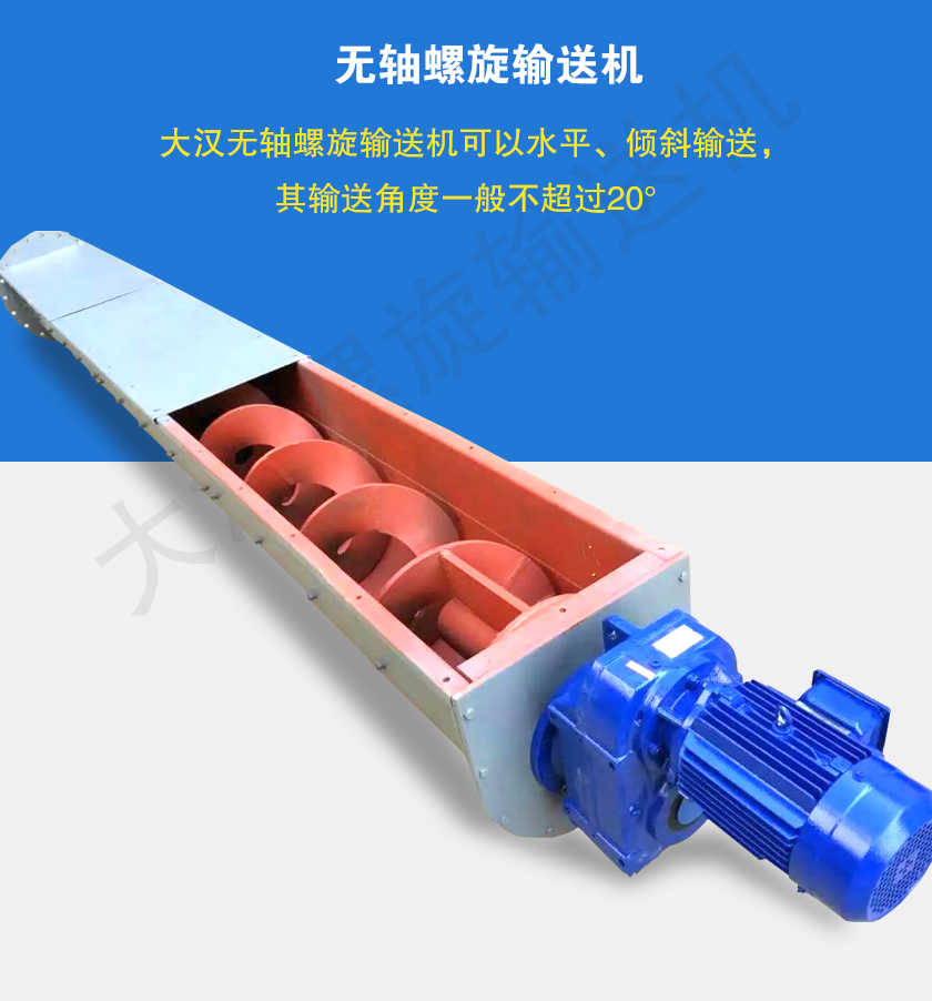 無軸螺旋輸送機(jī)廣泛應(yīng)用于建材、冶金、化工、糧食等行業(yè),用于輸送粘性高、易于纏繞的粉末、顆粒及小塊狀物料,其輸送角度應(yīng)小于20°,采用特制襯板,可在高溫下工作。